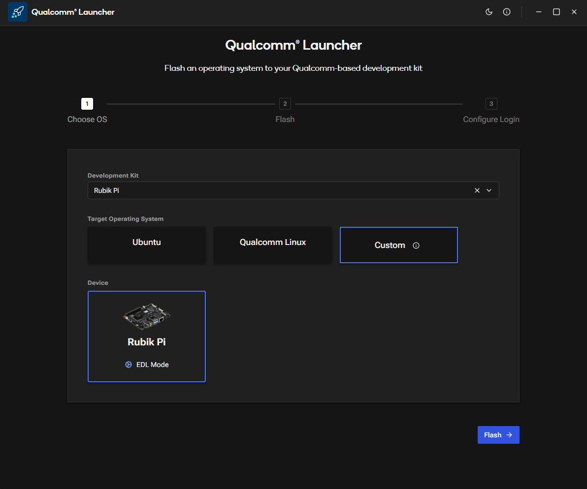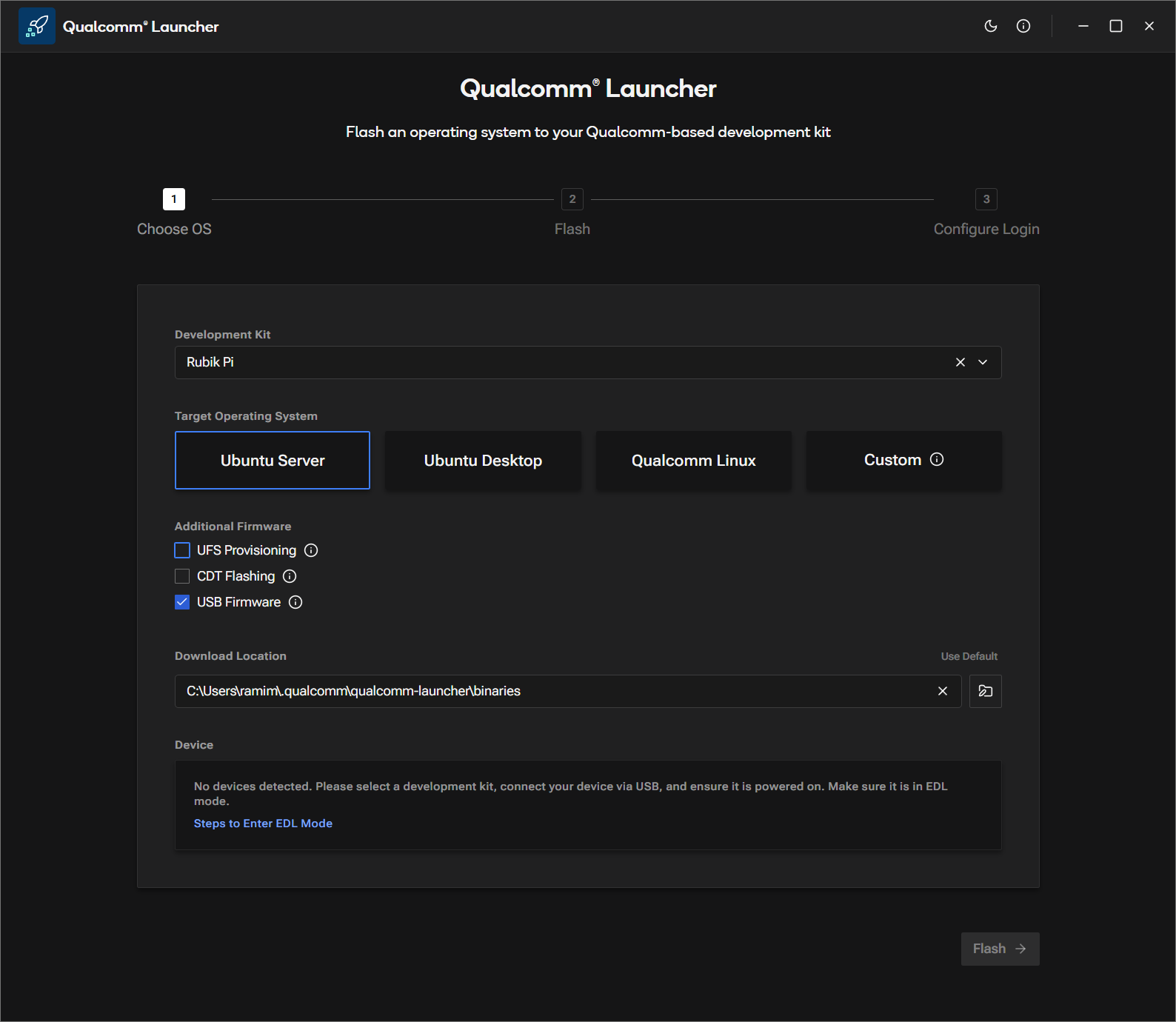 Qualcomm® Launcher is a user-friendly, GUI-based tool designed to simplify the process of downloading and flashing operating systems onto Qualcomm®-based development kits. This section provides step-by-step guidance to flash the Renesas USB firmware and replace the existing OS with a certified Canonical Ubuntu 24.04 server image.